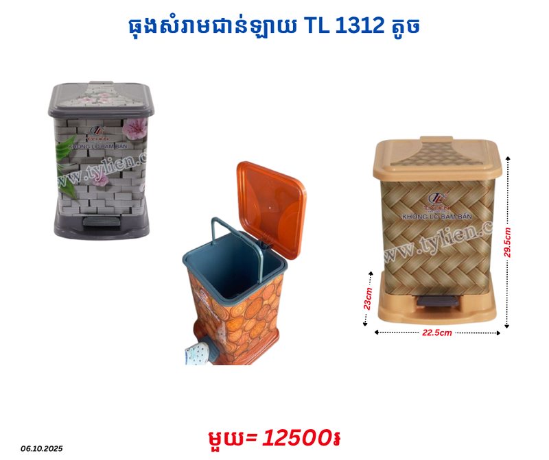 ធុងសំរាមជាន់ឡាយ TL 1312 តូច December 23, 2025 Posted in 12500, TL, ធុងសំរាម, ធុងសំរាមជាន់, ធុងសំរាមជាន់ឡាយ, ធុងសំរាមជាន់ឡាយ TL Product Code : 1312