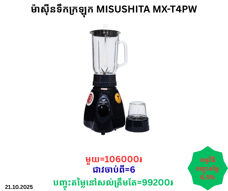 ម៉ាស៊ីនទឹកក្រឡុក Misushita MX-T4PW November 25, 2025 Posted in 99200, Misushita, ម៉ាស៊ីនទឹកក្រឡុក, ម៉ាស៊ីនទឹកក្រឡុក Misushita