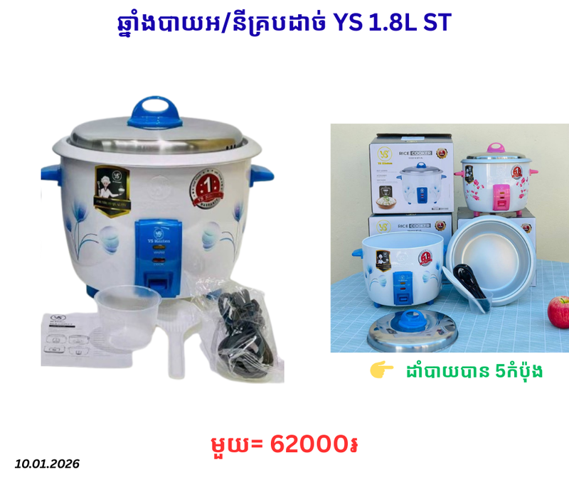 ឆ្នាំងបាយអ/នីគ្របដាច់ YS 1.8L ST January 10, 2026 Posted in 62000, CN, ST, ឆ្នាំង, ឆ្នាំងបាយ, ឆ្នាំងបាយអ/នី, ឆ្នាំងបាយអ/នីគ្របដាច់, ទំនិញថ្មី