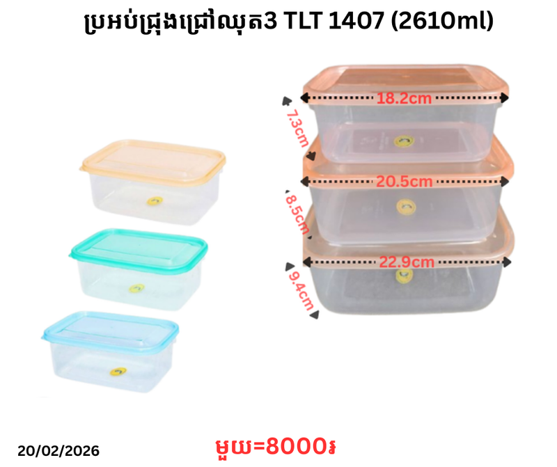 ប្រអប់ជ្រុងជ្រៅឈុត3 TLT 1407 (2610ml) November 9, 2025 Posted in 8000, TLT, ប្រអប់, ប្រអប់ជ្រុងឈុត, ប្រអប់ជ្រុងឈុត TLT, ប្រអប់ឈុត, ប្រអប់ម្ហូប Barcode : 8936047250974