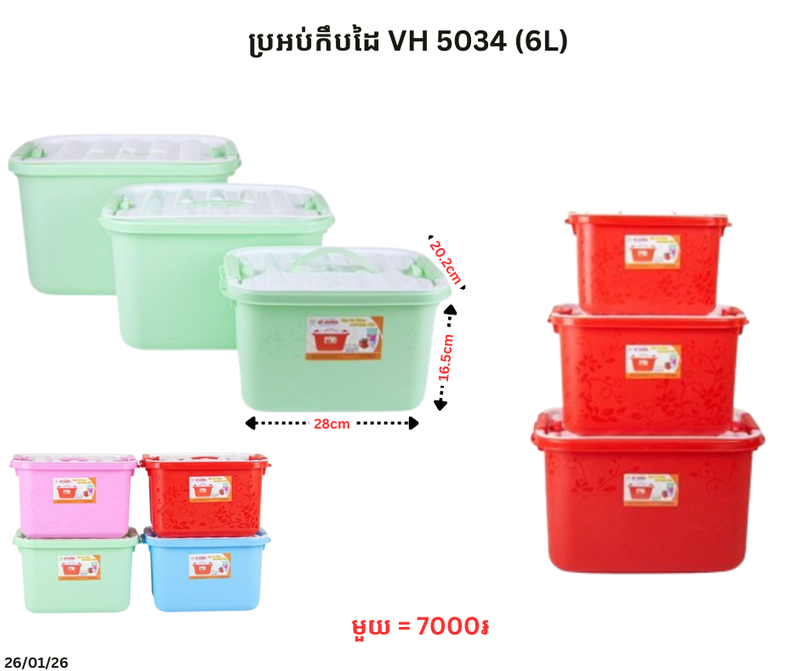 ប្រអប់កឹបដៃ VH 5034 (6L) January 27, 2026 Posted in 7000, VH, ទំនិញថ្មី, ប្រអប់, ប្រអប់កឹបដៃ, ប្រអប់កឹបដៃ VH Barcode : 8935124550341