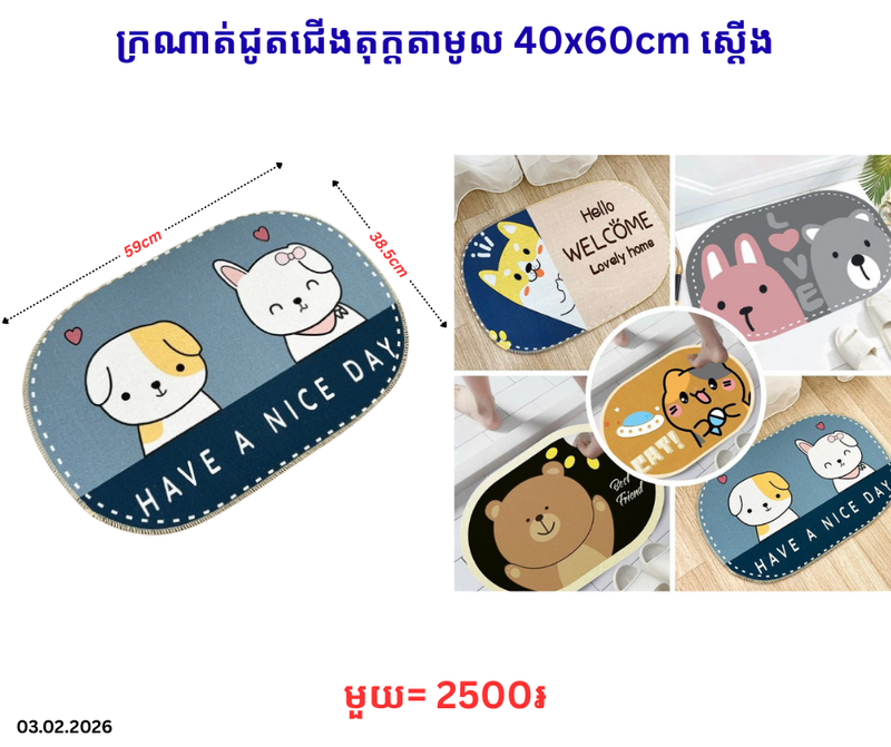 ក្រណាត់ជូតជើងតុក្តតាមូល 40x60cm ស្ដើង December 20, 2025 Posted in 2500, ក្រណាត់ជូត, ក្រណាត់ជូតជើង, ក្រណាត់ជូតជើងតុក្កតាមូល, ក្រណាត់ជូតជើងតុក្តតា, ទំនិញថ្មី Product Code : P0009004