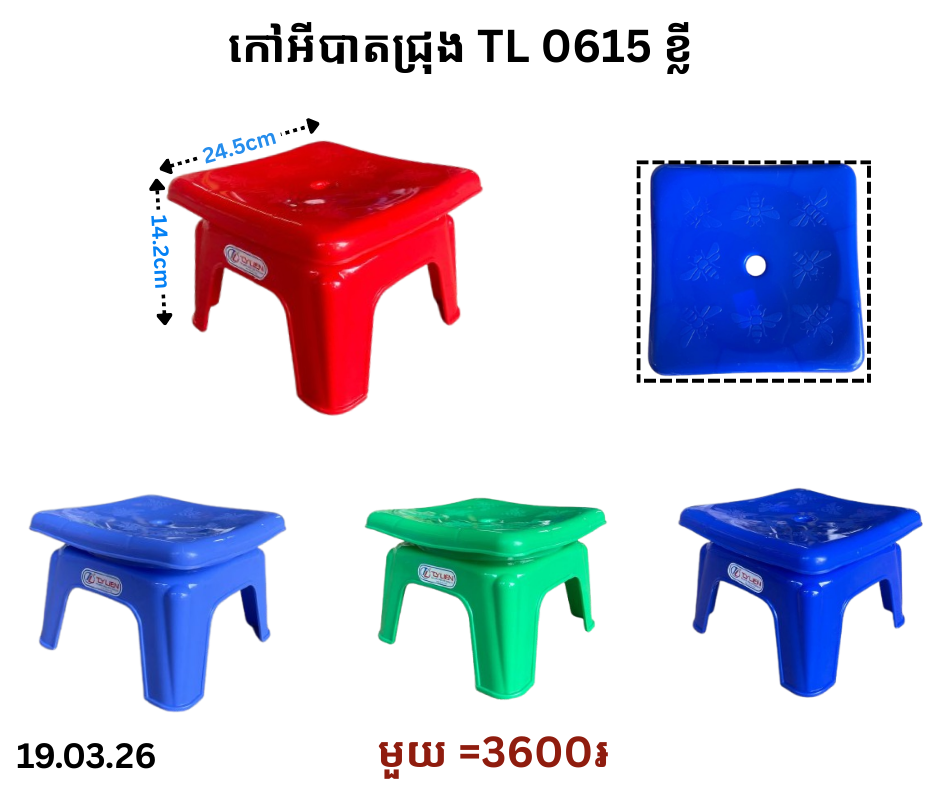 កៅអីបាតជ្រុង TL 0615 ខ្លី March 19, 2026 Posted in 3600, TL, កៅអី, កៅអីខ្លី, កៅអីខ្លី TL, កៅអីបាតជ្រុង, កៅអីបាតជ្រុង TL តម្លៃ: 3600 ៛ Barcode: 8936082383248 | Factory: