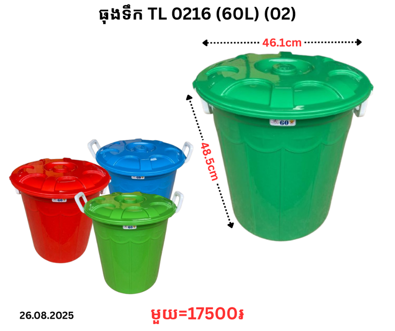 ធុងទឹក TL 0216 (60L) (02) December 24, 2025 Posted in 17500, TL, ធុងទឹក, ធុងទឹក TL Product Code : 0216